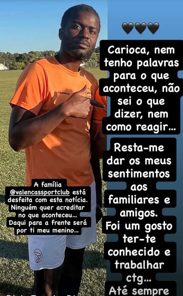 Conhecido por Yago Carioca, muito estimado por toda a equipa e restantes clubes alentejanos, era craque do Valenças, que disputa a Liga da AFE – Associação de Futebol de Évora (AFE). O atleta deixa órfã uma menina de quatro anos de idade.