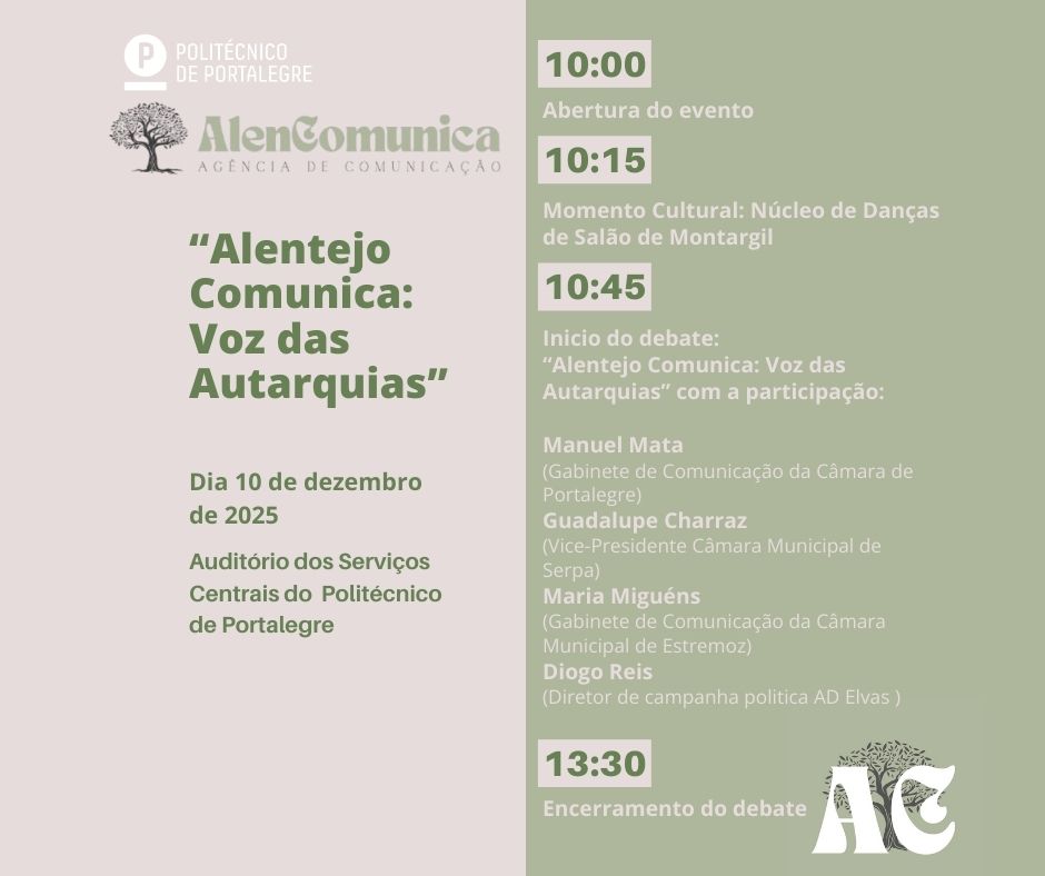 “Alentejo Comunica: Voz das Autarquias” é o tema do evento, que vai ter lugar no auditório dos serviços centrais do IPP, a partir das 10:00, organizado por estudantes do projeto académico AlenComunica.