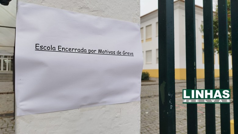 Avisos afixados à entrada do estabelecimento informam que a escola se encontra “Encerrada por motivos de greve”.