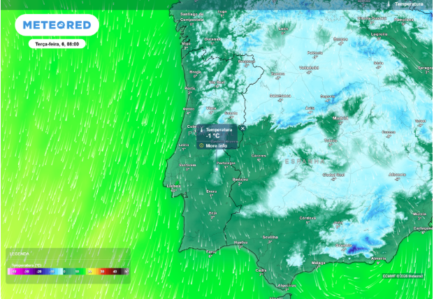 Segundo os mapas meteorológicos, enquanto na madrugada de segunda-feira as temperaturas negativas abrangerão de forma quase homogénea o interior Norte e Centro, na madrugada de terça-feira o frio será mais irregular no Norte, mas com uma maior extensão para o Sul do país. Portalegre poderá registar temperaturas mínimas a rondar os -1 ºC.