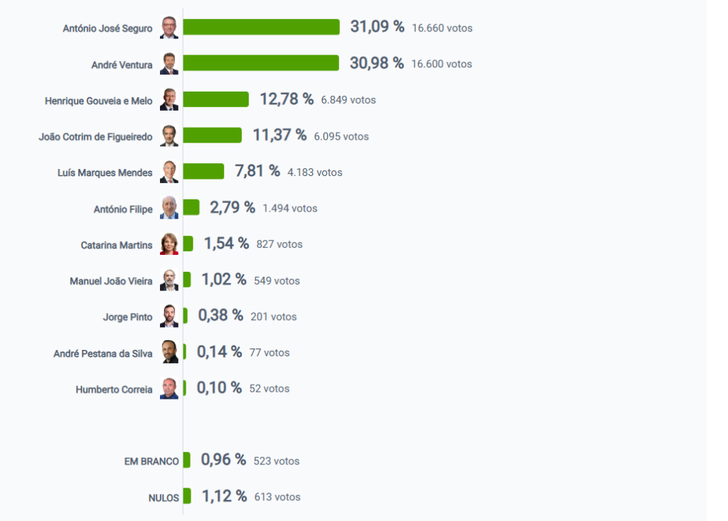 O segundo candidato mais votado foi André Ventura com 30,98%, e o terceiro foi Henrique Gouveia e Melo, com 12,78% dos votos, segundo os dados da Secretaria-Geral do Ministério da Administração Interna – Administração Eleitoral.
