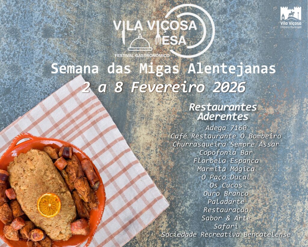 O Município de Vila Viçosa promove, entre os dias 2 e 8 de Fevereiro de 2026, a Semana Gastronómica das Migas Alentejanas, integrada no Festival Gastronómico “Vila Viçosa à Mesa” 2026.