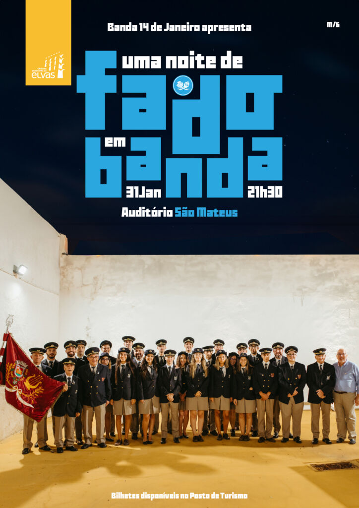A Banda 14 de Janeiro apresenta, no próximo dia 31 de Janeiro, o espetáculo “Uma Noite de Fado em Banda”, que terá lugar às 21h30, no Auditório São Mateus, em Elvas.