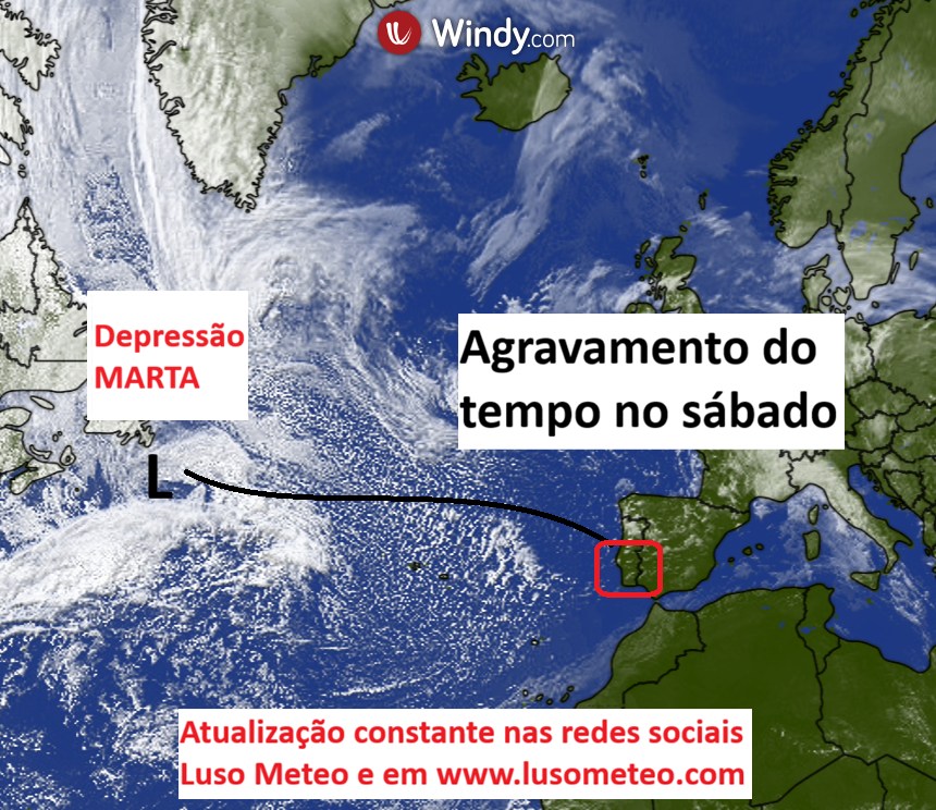 Portugal continental vai começar a sentir no sábado de manhã os efeitos da depressão Marta, que traz chuva, neve, vento e agitação marítima e uma nova subida dos caudais dos rios e ribeiras a sul do rio Tejo.