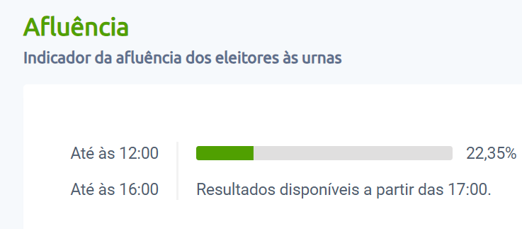 A participação registada nesta segunda volta até às 12h00 é superior à verificada no mesmo período da primeira volta das eleições. No primeiro sufrágio, a afluência às urnas situou-se nos 21,18% até às 12h, o que representa menos 1,17% face ao registado esta manhã.