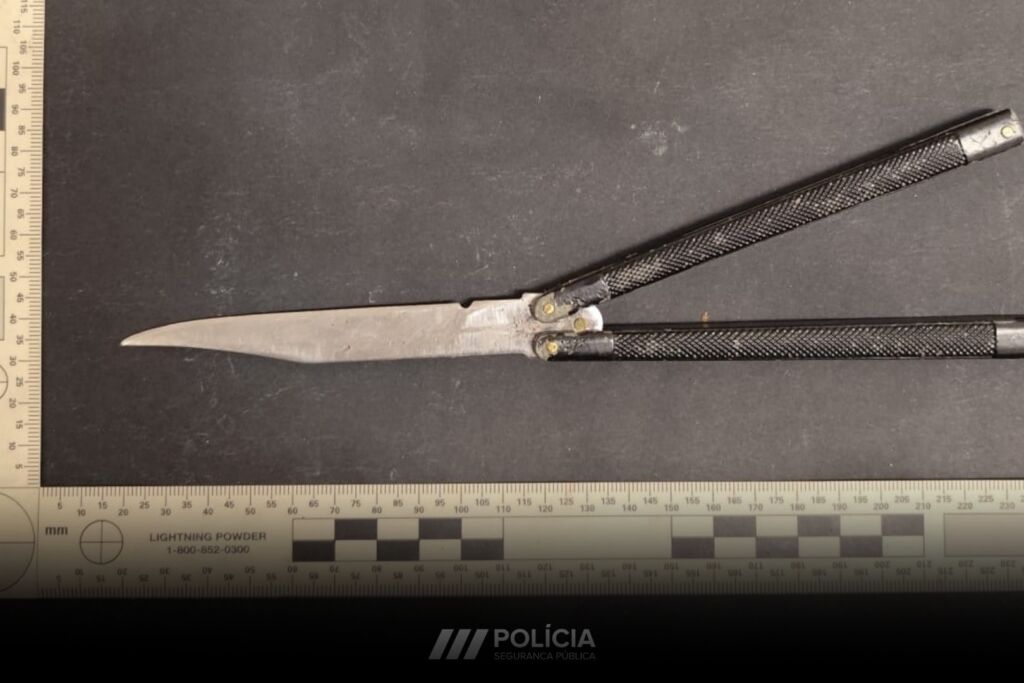Foi igualmente detido um jovem de 18 anos por posse de arma proibida. O suspeito tinha na sua posse, num local de acesso ao público, uma arma da Classe A, concretamente uma faca do tipo “borboleta”, vulgarmente conhecida como “butterfly”.