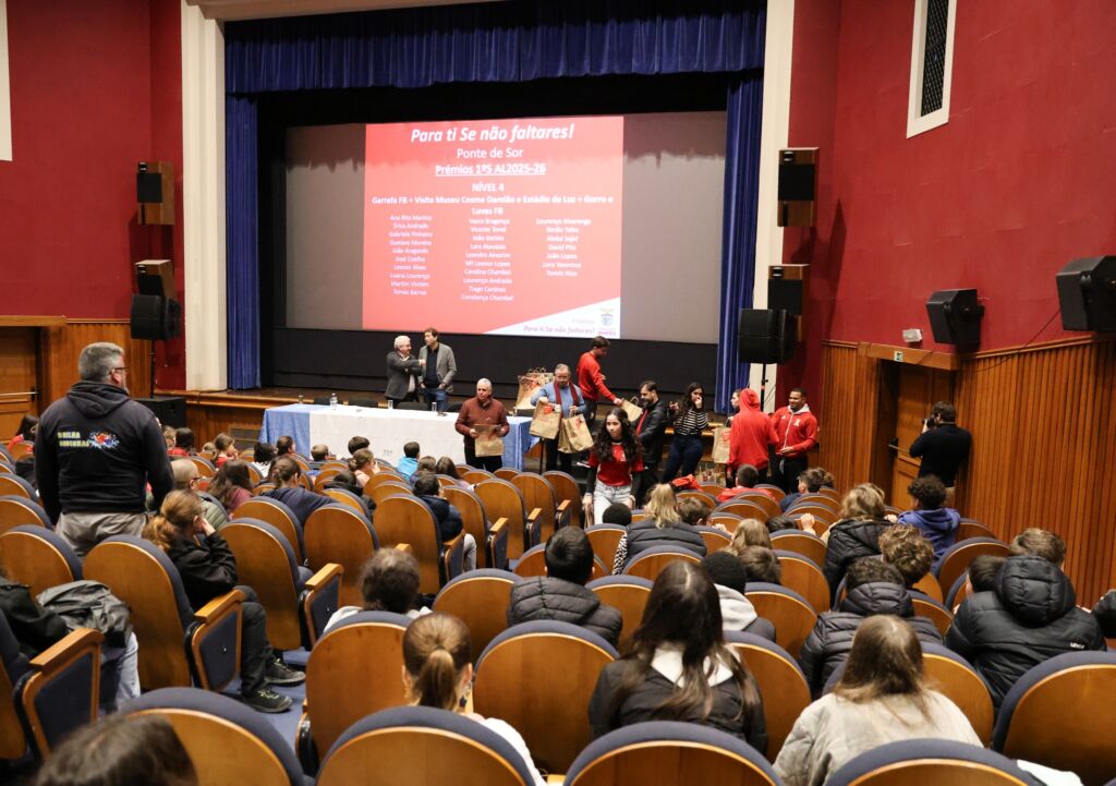 O Município de Ponte de Sor promoveu, na quarta-feira, dia 18 de Fevereiro, a cerimónia de entrega de prémios do projeto “Para Ti Se Não Faltares”, numa sessão que decorreu no Teatro Cinema da cidade. A iniciativa reconheceu o empenho e a assiduidade dos alunos ao longo do primeiro semestre do atual ano letivo.
