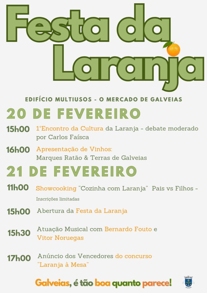 A iniciativa, segundo a junta de freguesia local, promotora do evento, decorrerá no Mercado de Galveias, tendo, no sábado pelas 15:00, a realização do 1.º Encontro da Cultura da Laranja, que pretende destacar a importância deste fruto na identidade local.