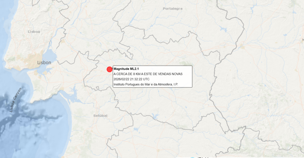 O Instituto Português do Mar e da Atmosfera informou, através de um comunicado dirigido a este semanário, que foi registado, pelas 21:32 deste domingo, 22 de Fevereiro, nas estações da Rede Sísmica do Continente, um sismo de magnitude 2.1 (Richter) e cujo epicentro se localizou a cerca de 8 km a Este de Vendas Novas.