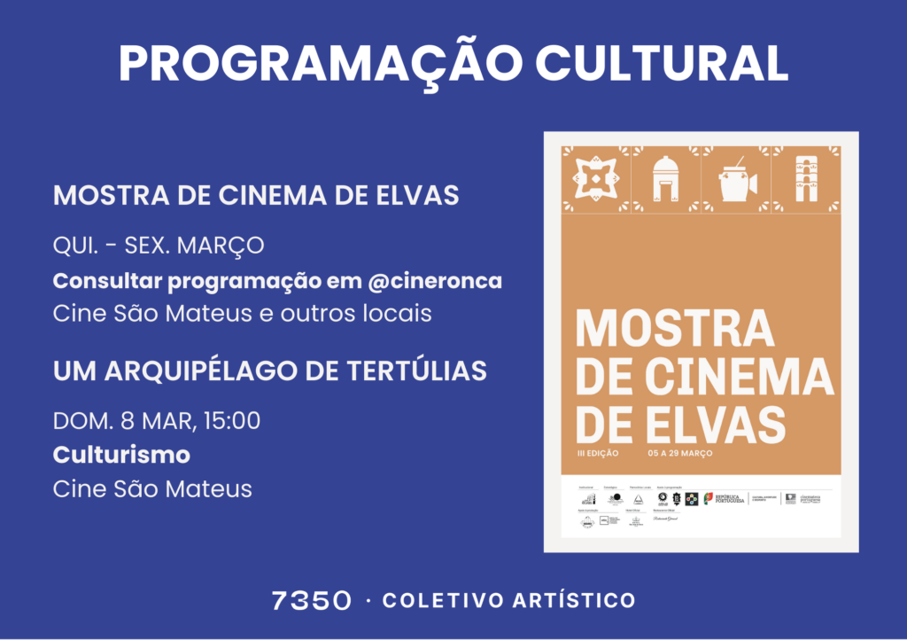 A Associação Coletivo Artístico 7350 apresentou, em comunicado dirigido a este semanário, a sua programação cultural para o mês de março, com destaque para o cinema e para o reforço do debate estratégico em torno da cultura no concelho de Elvas.