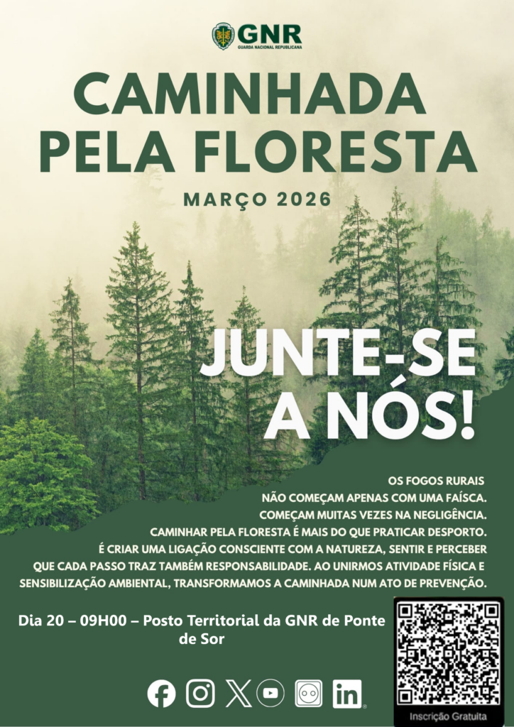 O Comando Territorial de Ponte de Sor da GNR vai realizar, no próximo dia 20 de março, pelas 09h00, uma “Caminhada pela Floresta”, com concentração, partida e chegada no Posto Territorial de Ponte de Sor da GNR.