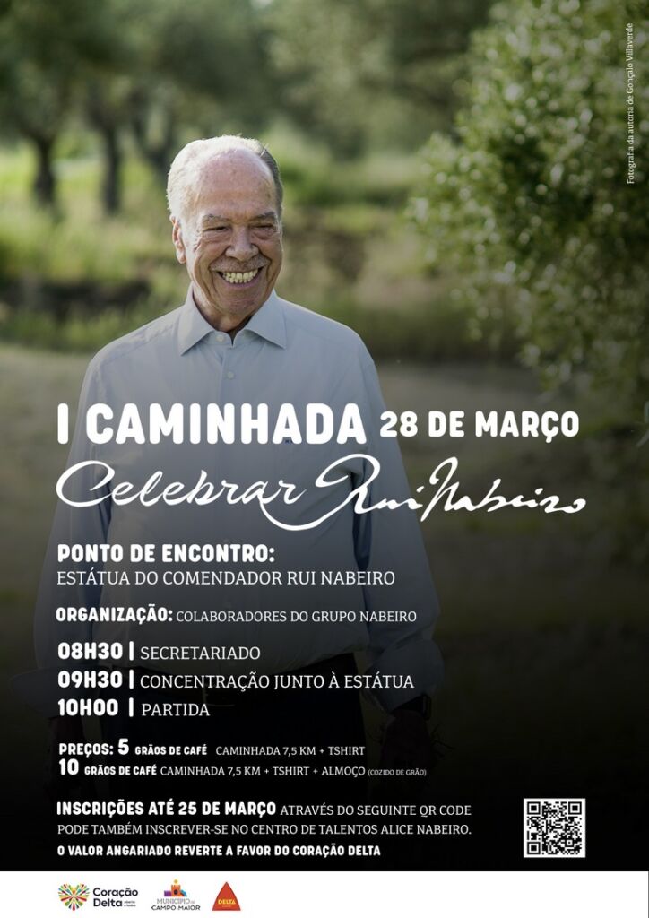 No próximo dia 28 de Março, data de aniversário do Comendador Rui Nabeiro, realiza‑se a primeira caminhada em sua homenagem, uma iniciativa que parte de um grupo de colaboradores de Campo Maior para celebrar o legado humano, social e empresarial do fundador do Grupo Nabeiro – Delta Cafés.