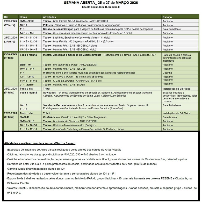 A Escola Secundária D. Sancho II deu início, esta segunda-feira, 23 de Março, à sua Semana Aberta, uma iniciativa que pretende aproximar a comunidade educativa da escola, dando a conhecer projectos, cursos e actividades desenvolvidas pelos alunos e professores ao longo do ano lectivo.