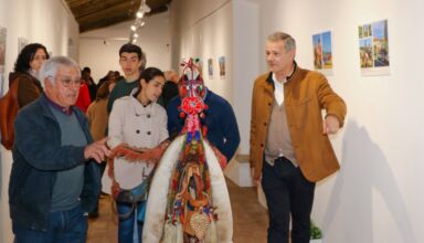 Costumes dos ‘Romeiros de Esperança’ embelezam galeria municipal do templo recentemente reabilitado.