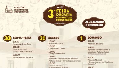A III Feira de Doçaria Conventual de Vila Viçosa, marcada para os dias 30 e 31 de janeiro e 1 de fevereiro, irá realizar-se em espaços interiores do Convento dos Agostinhos. A decisão foi tomada tendo em conta as condições meteorológicas previstas para os próximos dias, garantindo assim o conforto e a segurança de visitantes e expositores.