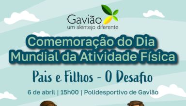 O Município de Gavião vai comemorar o Dia Mundial da Atividade Física com um evento direcionado para famílias. Sob o tema "Pais e Filhos - O Desafio", a iniciativa ocorrerá no dia 6 de abril, às 15h00, no Polidesportivo de Gavião.