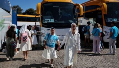 Autocarros vindos de Madrid com peregrinos a caminho da Jornada Mundial da Juventude (JMJ) chegam, a “conta-gotas”, à Área de Serviço de Estremoz da A6 para a derradeira paragem antes de Lisboa.