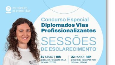 O Politécnico de Portalegre realiza, nos dias 14 e 22 de Maio, pelas 18 horas, sessões de esclarecimento online sobre como os alunos titulares dos cursos de dupla certificação do ensino secundário (cursos profissionais) e cursos artísticos especializados podem concorrer às licenciaturas através do Concurso Especial de ingresso no Ensino Superior para Diplomados das Vias Profissionalizantes.
