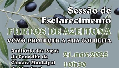 A Câmara Municipal de Alandroal vai promover, no próximo dia 21 de novembro de 2025, uma Sessão de esclarecimento sobre furtos de azeitona, destinada a apoiar agricultores e proprietários rurais na proteção das suas colheitas. O encontro decorrerá no Auditório dos Paços do Concelho, a partir das 10h30, com entrada livre.